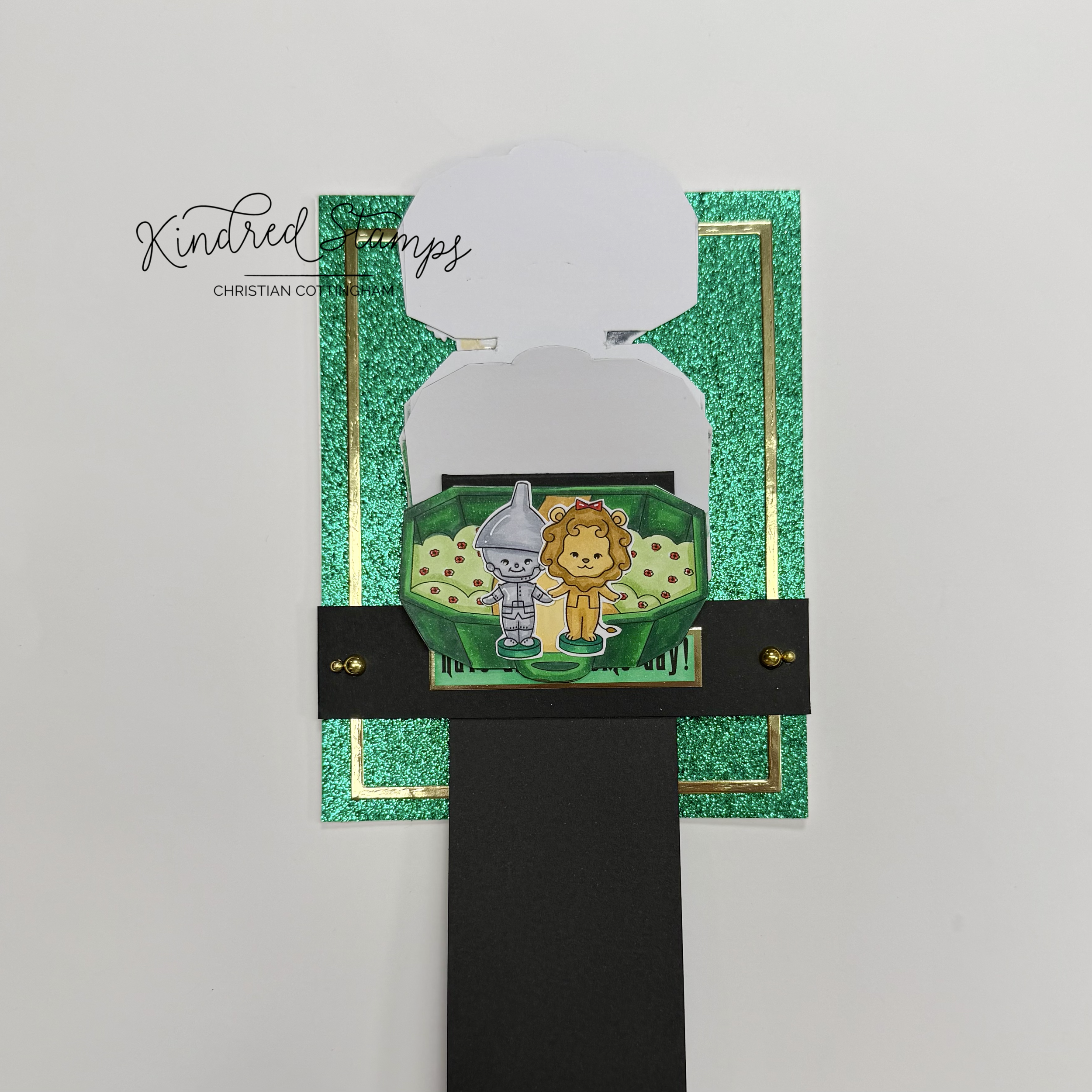 To place the images onto the mechanism, it is important that the images are only adhered to the individual sections between the score lines. This is what will lift and flip the image. If you adhere to all of the sections, you will have no flip just a flop. Working from the bottom section, adhesive was placed in-between the third section of score lines from the top of the mechanism. One of the base only designs was lined up without going over the top of the score line. The Metal Man and Lion were adhered to the base without going over the top of the score line. This process was repeated with the second base on the section of score lines and the Girl and Scarecrow. Finally, the complete pocket was adhered to the top section of the score lines. The two witches were adhered to the design. The remainder of the mechanism was trimmed to be flush with the card. I chose not to decorate this mechanism, but a “pull” stamp would be great to give instruction. Finally a couple shiny gold bits were placed on the sides of the belly band because why not!