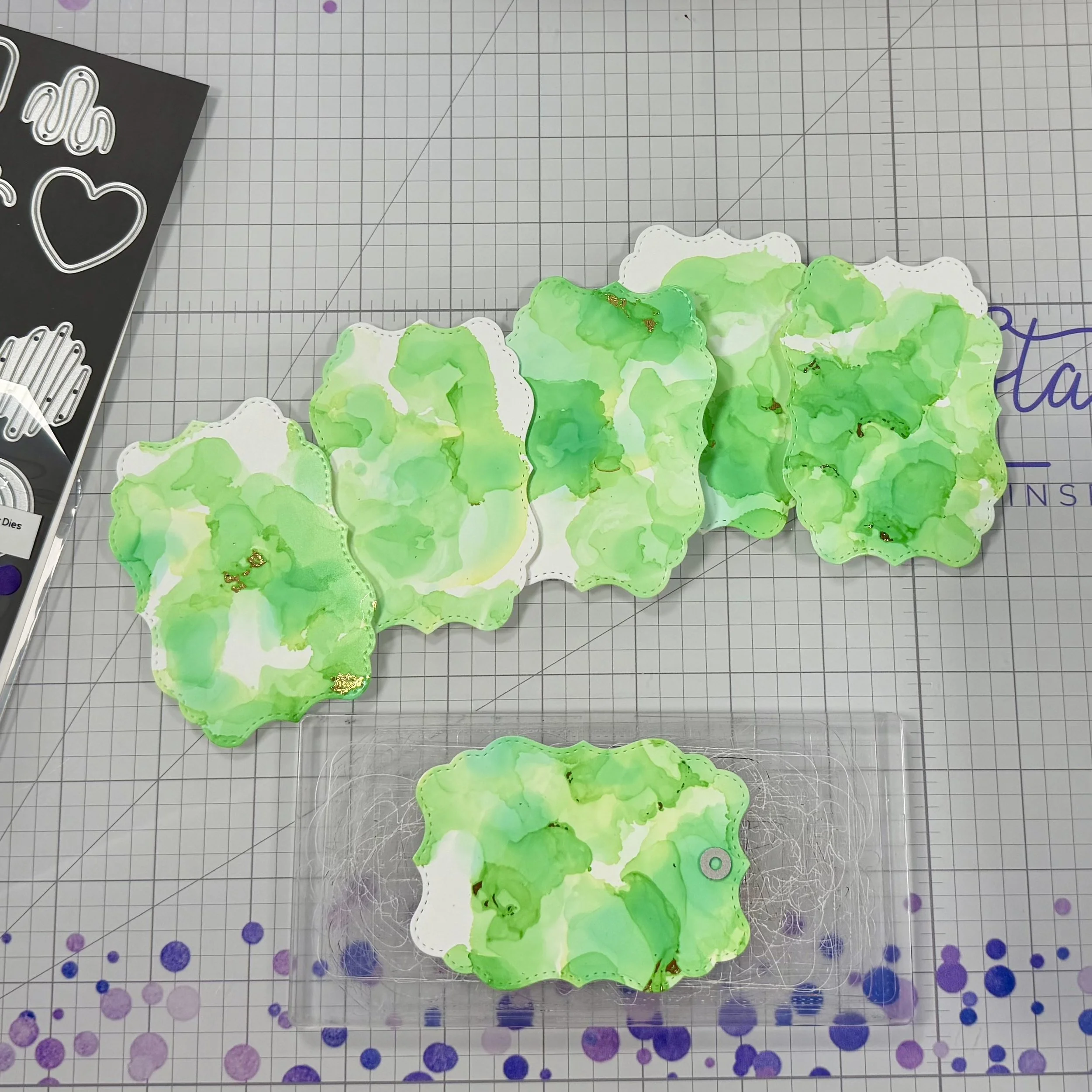 I wanted the tags to be simple but have lots of character and alcohol ink with some foil was the perfect pairing. To make the alcohol ink background, I pulled out some coated paper. In this instance, I dug in my hoarder stash and came across some old photo paper (remember when you printed photos at home on your printer???). Using Altenew Artist Alcohol Ink in Minty Mint (G201), some 91% alcohol, and the hand held blow tool, the design came to be. Thermoweb Decofoil in Gold D’or was pressed into the tacky areas of the alcohol inked background.