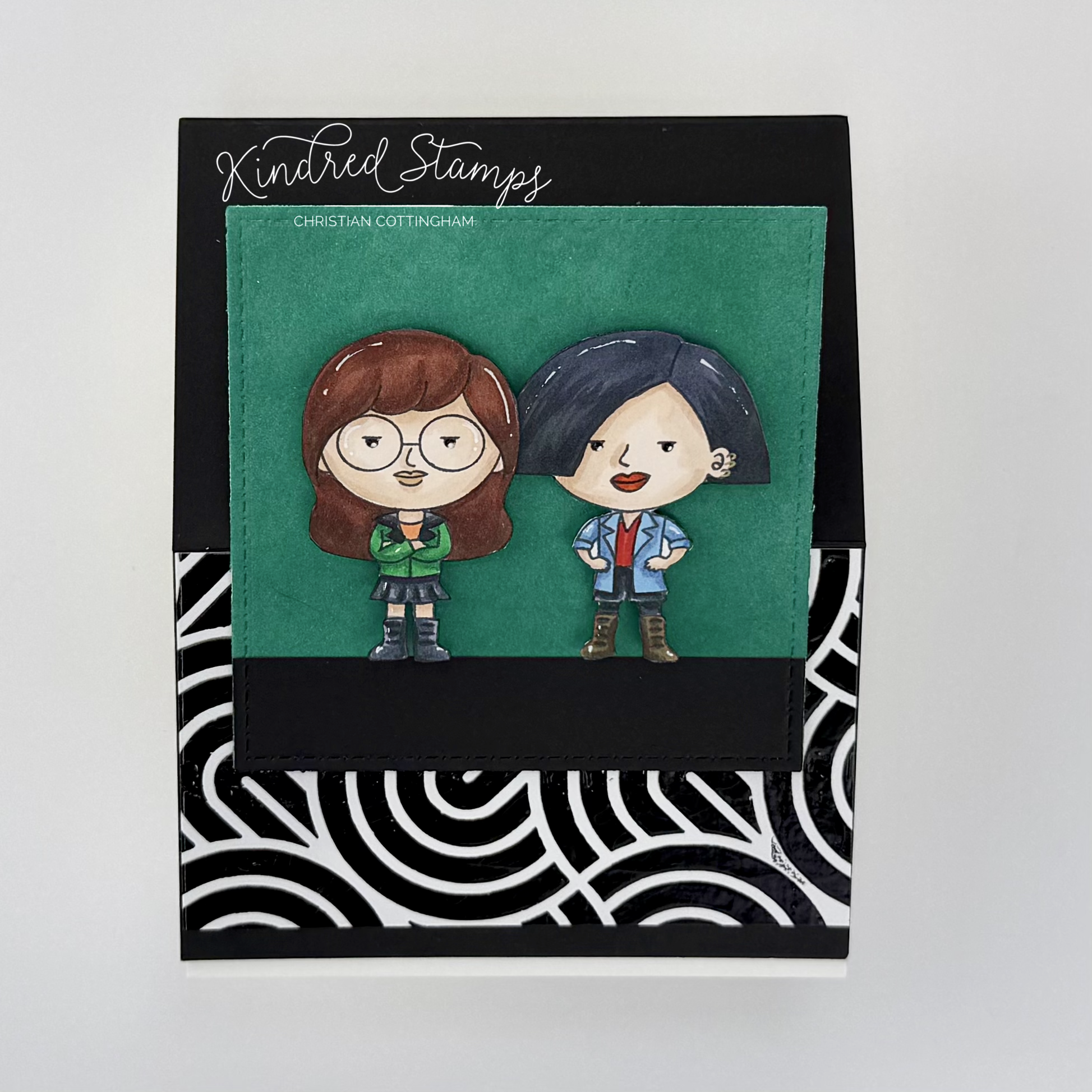 On a piece of 80lb Neenah Classic Crest Solar White card stock, Christmas Pine ink (Gina K Designs) was blended to provide the 90’s green that my college dorm bedding and decor exploded with. The inked section was then die cut with the square shape from the Card Basic Die Set. A scrap of black card stock was also cut with the square shape to provide the flooring that the Sarcastic Teens will be standing on. This black flooring was adhered to the green square. The teens were stuck into place with the previously applied foam tape.